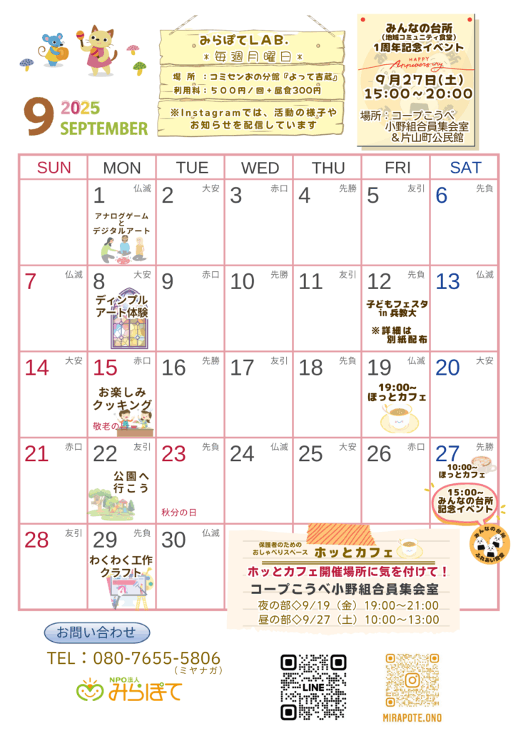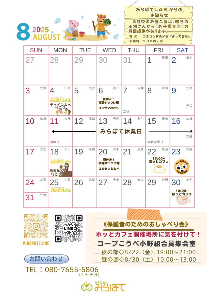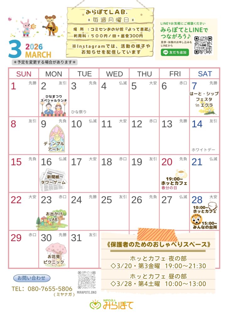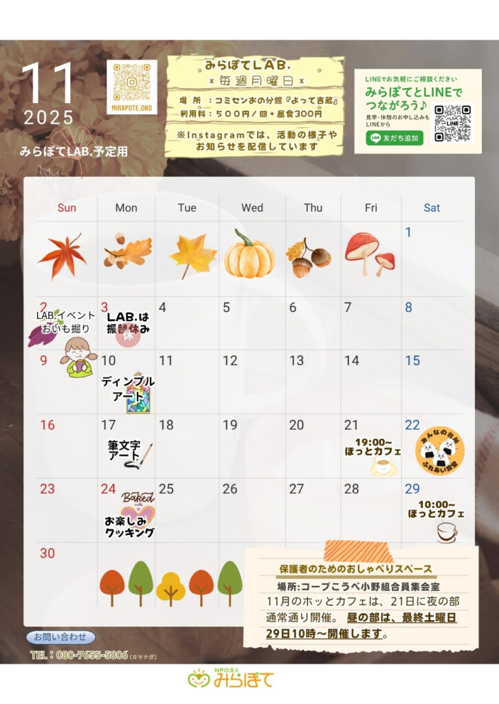 毎週月曜日の『みらぽてLAB.』のプログラム内容は予定であり、当日の利用する子どもたちの意見やスタッフの都合により変更する場合がございます。体験や見学を希望される方は、公式ラインへメッセージをお願いいたします。 11月の […]
