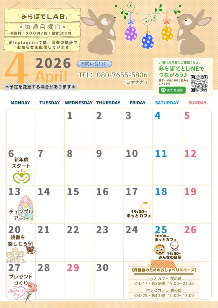 4月のみらぽてカレンダーです。毎週月曜日の『みらぽてLAB.』では、やってみたいを見つけようとする子どもたちの思いを尊重し過ごしております。 当日のプログラムが変更になる可能性もございますので、利用を検討されておられる方 […]